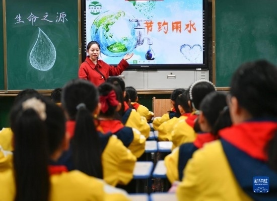 3月22日,在四川省廣安市前鋒區(qū)前鋒小學,老師在講解節(jié)水護水知識。