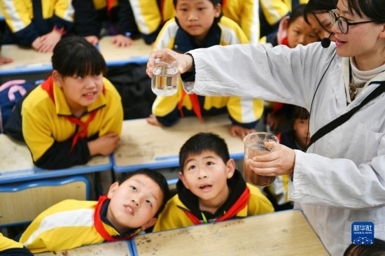 3月22日,在四川省廣安市前鋒區(qū)前鋒小學,老師在向?qū)W生展示過濾前后的水質(zhì)變化。