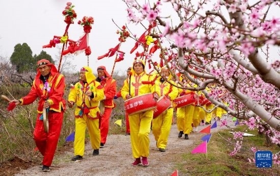 3月24日,在陜西省西安市臨潼區(qū)零口街道零塬村,當(dāng)?shù)氐姆俏镔|(zhì)文化遺產(chǎn)“百面鑼鼓”隊(duì)伍穿行于桃園中。