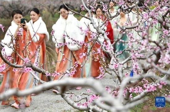 3月24日,在陜西省西安市臨潼區(qū)零口街道零塬村,漢服愛(ài)好者穿行于桃園中。
