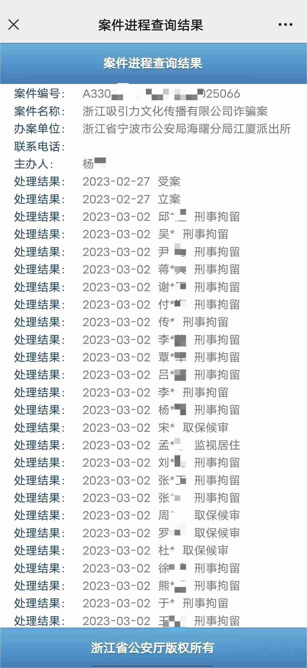 寧波警方一名辦案民警向記者證實了吸引力公司被調(diào)查一事。“涉及人員較多,我們現(xiàn)在也在找一些學(xué)員進行案件取證工作?!痹撁窬€證實,楊濤鳴真實姓名為“楊某成”。