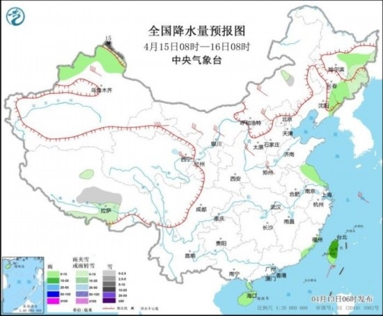 4月15日08時(shí)至16日08時(shí),黑龍江東南部、吉林東部、新疆北疆北部、西藏南部等地部分地區(qū)有小到中雪或雨夾雪,其中,新疆北疆北部局地有大到暴雪(10~15毫米)。黑龍江東部、吉林東部、遼寧東部、新疆北部、江淮東部、海南島、臺灣島等地部分地區(qū)有小雨,其中,臺灣島部分地區(qū)有中雨。內(nèi)蒙古中西部、西北地區(qū)中東部、華北大部等地部分地區(qū)有4~6級風(fēng),其中,新疆沿天山地區(qū)、甘肅河西等地部分地區(qū)有6~7級風(fēng)。東海北部海域?qū)⒂?~7級、陣風(fēng)8級的西北風(fēng),臺灣以東洋面將有5~7級、陣風(fēng)8級的東北風(fēng)。