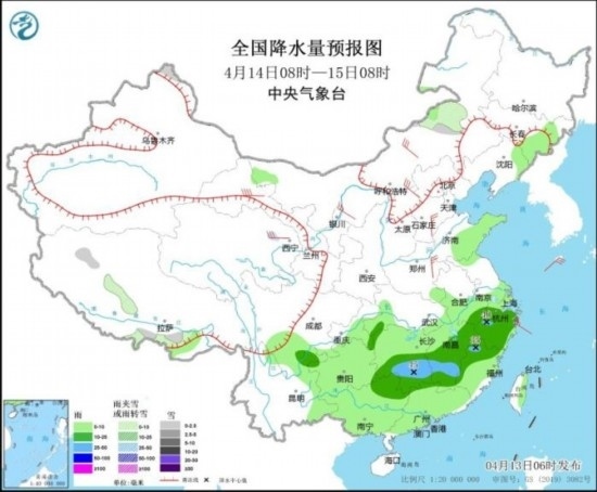 全國降水量預(yù)報(bào)圖(4月13日08時(shí)-14日08時(shí))。圖片來源:中央氣象臺網(wǎng)站