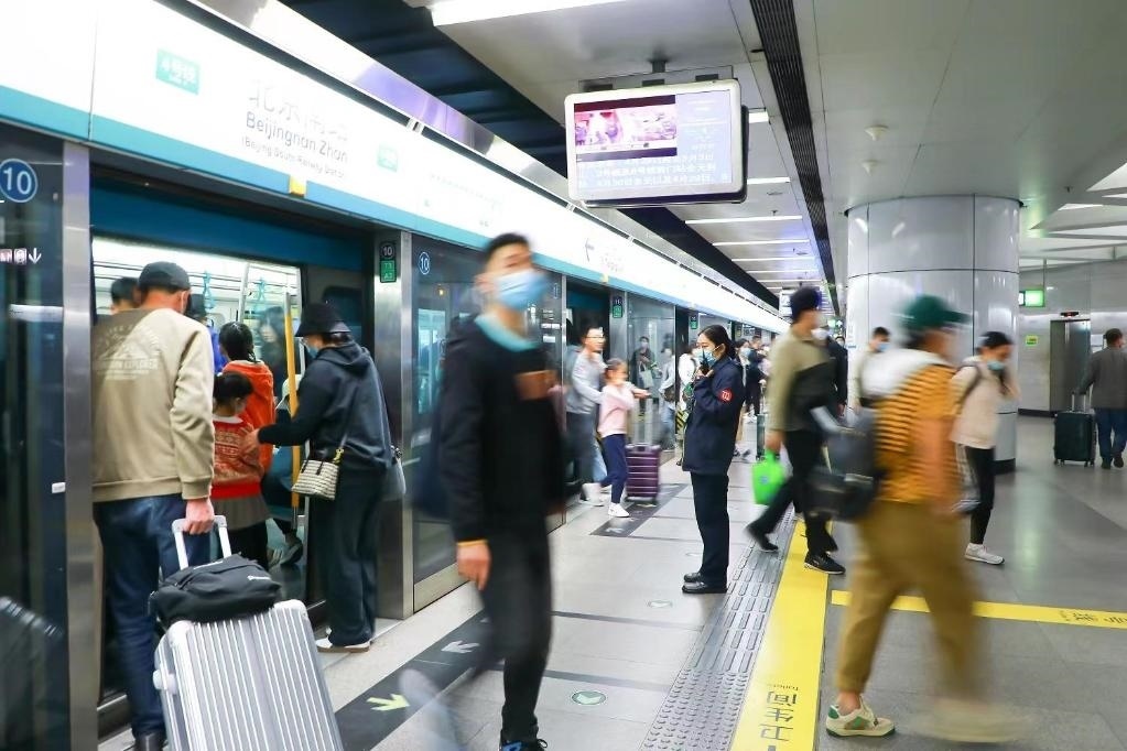“大家進(jìn)站時(shí)要小心腳下的行李箱。”3日14時(shí),隨著大量鐵路旅客抵達(dá)北京南站,地鐵4號(hào)線北京南站也開(kāi)始變得忙碌。站廳內(nèi),工作人員在自動(dòng)售票機(jī)、閘機(jī)前引導(dǎo)旅客快速購(gòu)票進(jìn)站;站臺(tái)上,軌道列車準(zhǔn)時(shí)抵達(dá),乘客快速流動(dòng)疏散。