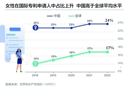 世界知識(shí)產(chǎn)權(quán)組織數(shù)據(jù)顯示,2021年,中國是全球國際專利(PCT)女性申請(qǐng)人的最大來源地。2022年,中國女性發(fā)明者所占比例為24%,高于全球平均水平。