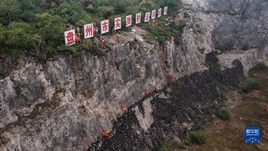 六盤水消防救援支隊(duì)隊(duì)員在進(jìn)行模擬高山峽谷救援演練(5月11日攝,無人機(jī)照片)。