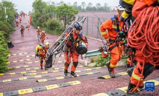 消防救援人員背負(fù)裝備前往演練場(chǎng)地(5月11日攝)。