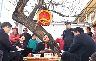 圖④:沂源法院東里人民法庭法官在中莊鎮(zhèn)河西一村現(xiàn)場(chǎng)開庭審理案件。(資料圖片)