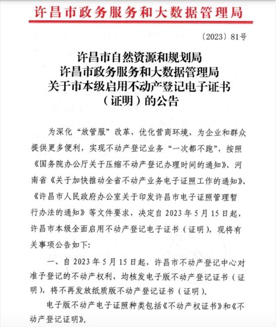 ·河南許昌:全面啟用不動(dòng)產(chǎn)登記電子證書,不再發(fā)放紙質(zhì)版證書。