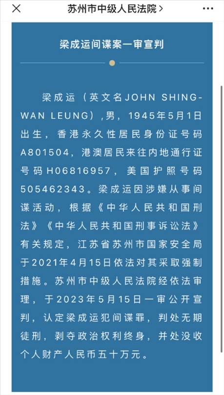 ·梁成運(yùn)犯間諜罪一審被判無期徒刑。