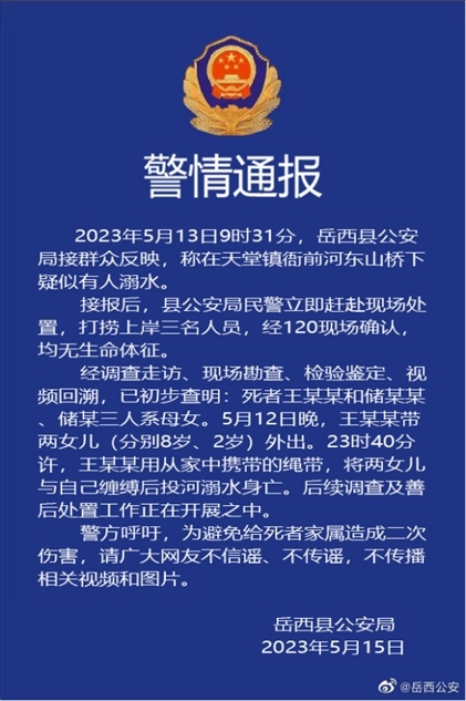 ·安慶警方通報(bào)母女三人溺亡:女子將兩女兒與自己纏縛后投河。