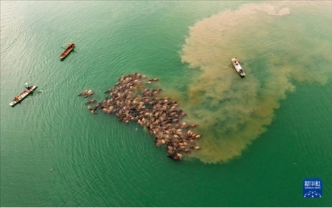 5月13日,在南充市蓬安縣相如鎮(zhèn)油房溝村嘉陵江段,成群結(jié)隊(duì)的水牛渡江。