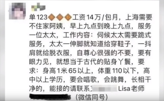 ·14萬(wàn)月薪招跪式保姆?上海閔行市監(jiān)局:家政公司涉虛假宣傳已立案。