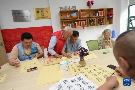 5月29日,在湖州市環(huán)渚街道玉堂橋社區(qū),凌法林(左二)指導(dǎo)殘障人士練習(xí)書(shū)法。