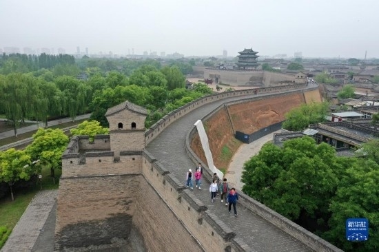 游客在平遙古城城墻上游覽(5月30日攝,無人機照片)。