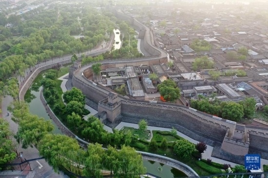 平遙古城一角(5月29日攝,無人機照片)。