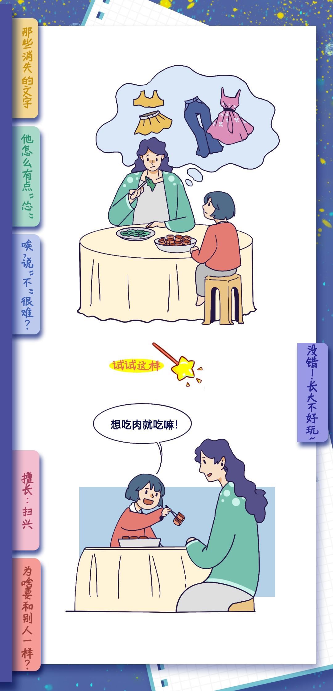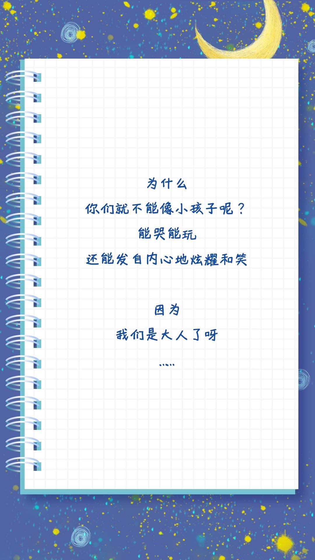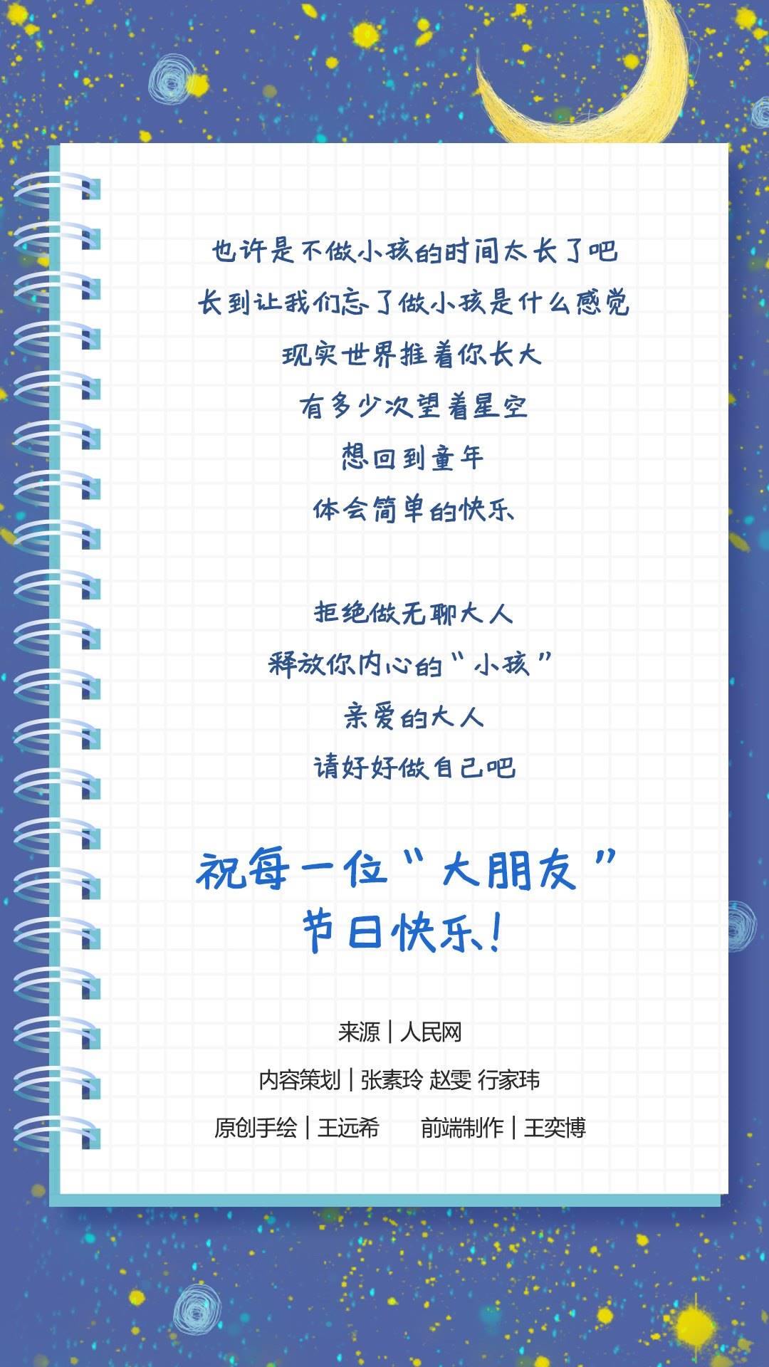 也許是不做小孩的時間太長了吧,長到讓我們忘了做小孩是什么感覺?,F(xiàn)實世界推著你長大,有多少次仰望星空,想回到童年,體會簡單的快樂。拒絕做無聊大人,釋放內(nèi)心的“小孩”,親愛的大人,請好好做自己吧!祝每一位“大朋友”節(jié)日快樂!