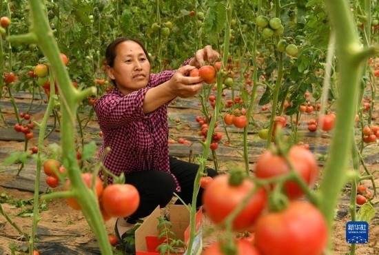 6月4日,農(nóng)民在獻縣河城街鎮(zhèn)梅莊洼農(nóng)場大棚內(nèi)采摘西紅柿。