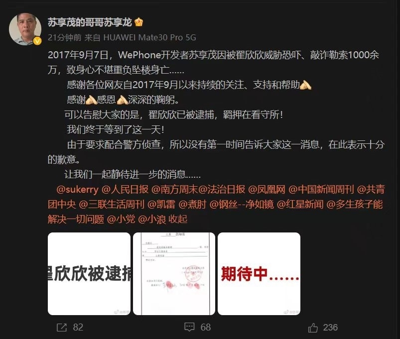 事發(fā)5年多之后,2023年6月9日,蘇享茂的哥哥蘇享龍通過(guò)個(gè)人微博稱,“翟欣欣已被逮捕,羈押在看守所?!碧K享龍?zhí)峁┑募由w北京海淀區(qū)公安局公章的立案通知書顯示,翟欣欣敲詐勒索一案,該局認(rèn)為符合立案條件,現(xiàn)立案?jìng)刹椤?/p>