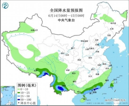 6月13日08時(shí)至14日08時(shí),云南南部、廣西南部和東部、廣東大部、臺(tái)灣島中南部、西藏東南部等地有大雨,局部地區(qū)有暴雨(50~90毫米)。新疆東部等地有5~6級(jí)風(fēng)(見(jiàn)圖3)。