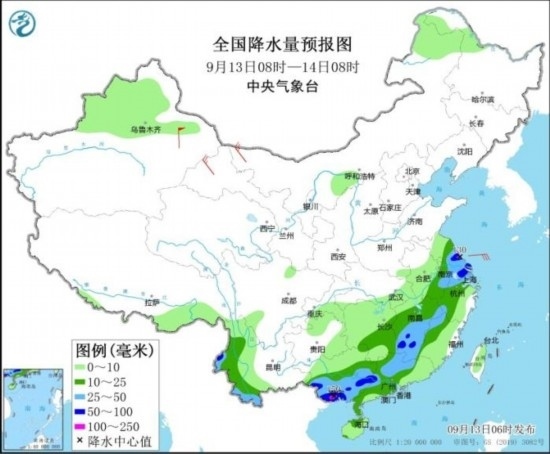 全國降水量預(yù)報(bào)圖(9月13日08時(shí)-14日08時(shí))