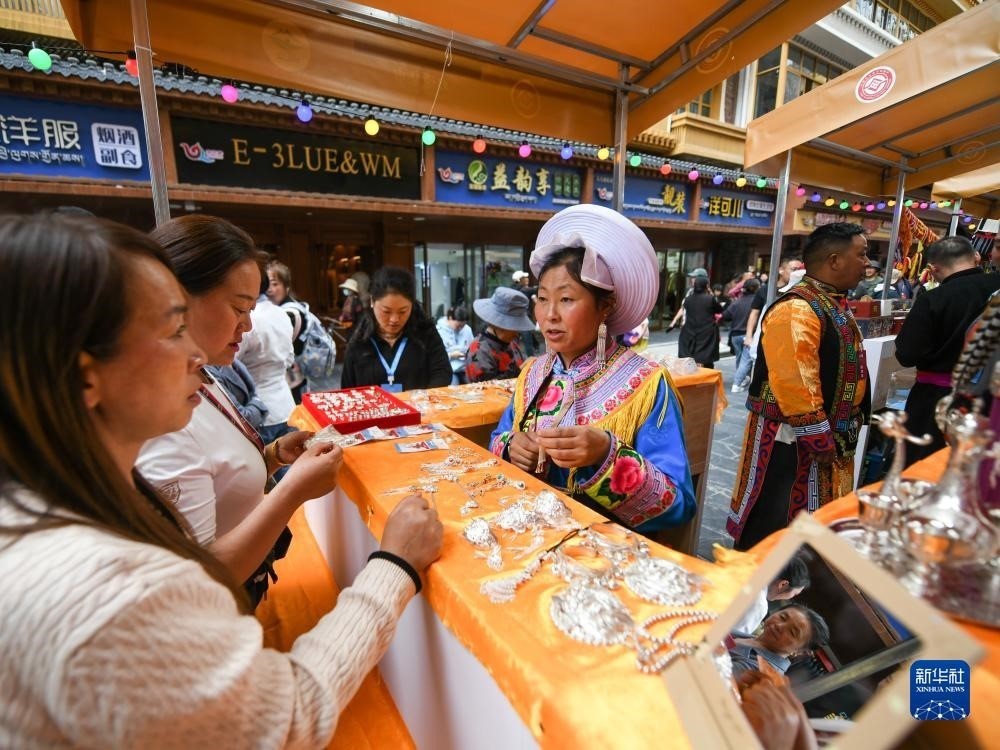 9月15日,在四川省阿壩藏族羌族自治州馬爾康市嘉絨特色街區(qū),游客在非遺集市上選購商品。