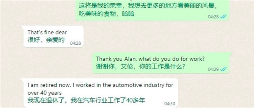 這個(gè)過程被他們稱為“切客”。張先生說,他們一般會(huì)通過分享新聞將對(duì)話引導(dǎo)到經(jīng)濟(jì)狀況的話題,然后進(jìn)一步觀察對(duì)方有沒有投資的興趣?!叭绻磻?yīng)很好的話,就直接引導(dǎo)他去投資,如果不好就繼續(xù)聊感情。”