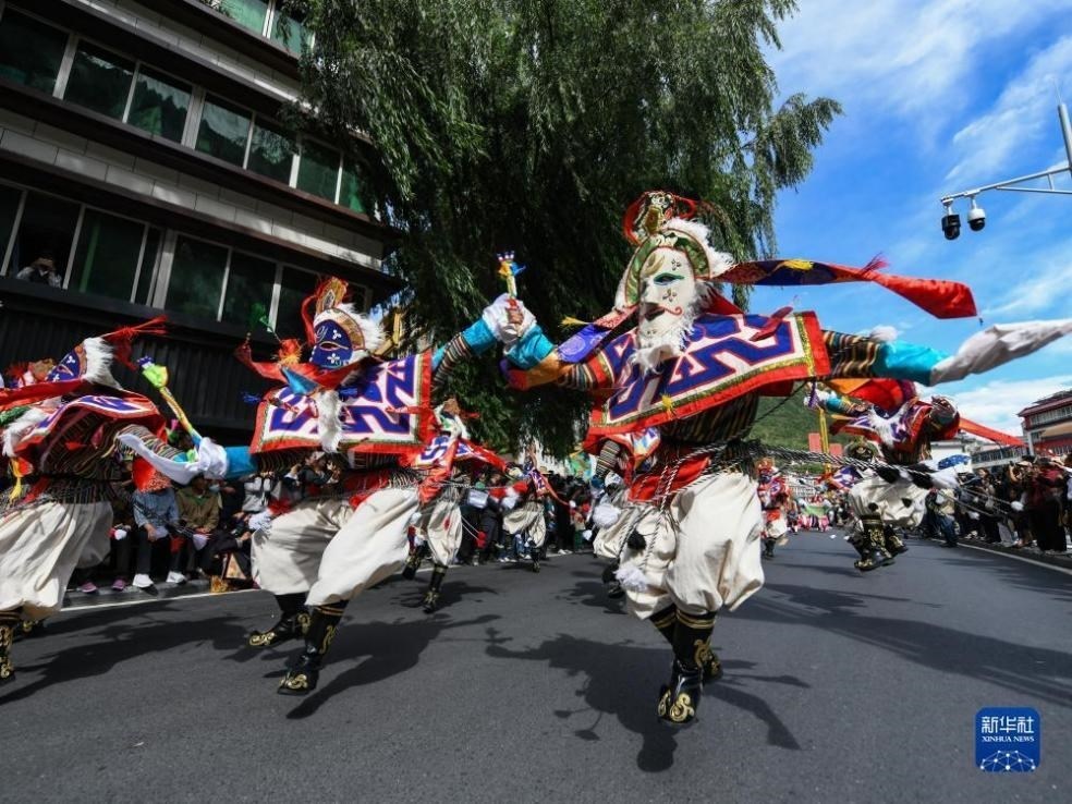 來(lái)自四川省阿壩藏族羌族自治州13個(gè)縣市的近千名演員在馬爾康市街頭開展巡游活動(dòng),展示阿壩州各個(gè)地區(qū)的非遺文化。