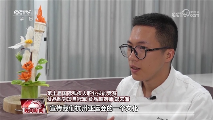 第十屆國際殘疾人職業(yè)技能競賽食品雕刻項目冠軍 食品雕刻師 鄭云海:最近有火炬(傳遞),寓意就是美好、和平,還有吉祥。我想用自己的技能去宣傳我們杭州亞運會的一個文化。