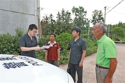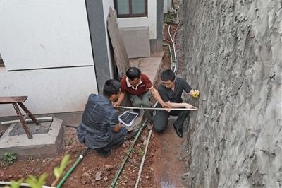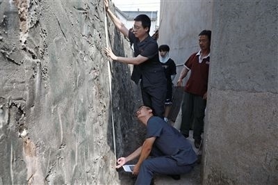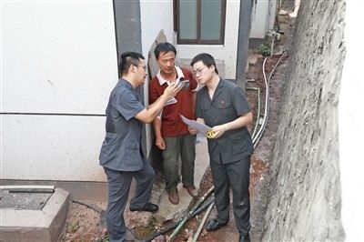 執(zhí)行干警丈量排水溝寬度。