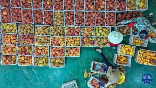 7月7日,在臨湘市聶市鎮(zhèn)乘嶺社區(qū)的涓湖果園,果農(nóng)在分揀蟠桃(無(wú)人機(jī)照片)。