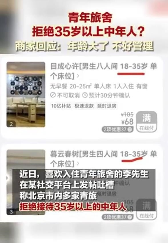 近日,#青旅不接待35歲以上人群#話題沖上熱搜,引發(fā)熱議。該話題源于一網(wǎng)友發(fā)布的帖子。該帖子表示,某平臺(tái)上北京不少青旅商家拒絕年齡35歲以上的人群入住。該網(wǎng)友詢問原因,得到的回答是“年齡大的上下床不安全容易出事?!睂?duì)此答復(fù),不少網(wǎng)友不能認(rèn)同,認(rèn)為是“借口”。