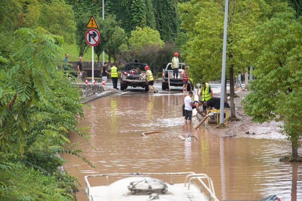 7月14日,在重慶市萬州區(qū)江南新區(qū),救援人員進(jìn)行排水搶險(xiǎn)作業(yè)。新華社記者 唐奕 攝