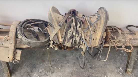 圖為五里村村史館展覽的過去運(yùn)輸貨物和生活必需品上山的馬駝用具。新華網(wǎng) 陳穎 攝