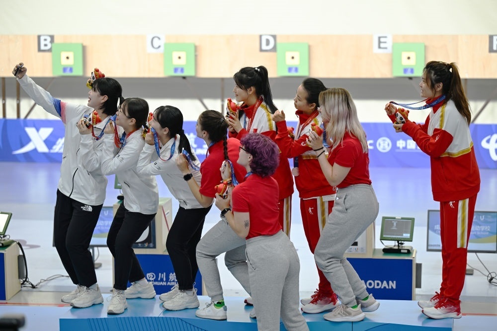 7月29日,大運會射擊女子10米氣步槍團體前三名選手在頒獎儀式上合影。新華社記者 劉坤 攝