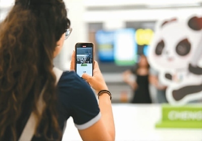 成都天府國際機場內,抵蓉的巴西代表團成員在等候行李時拍攝機場內的大運會吉祥物“蓉寶”裝飾。新華社記者 胥冰潔攝