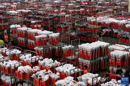 一名工作人員在昆明國(guó)際花卉拍賣交易中心內(nèi)對(duì)臺(tái)車上存放的鮮花進(jìn)行掃碼(7月13日攝)。新華社記者 陳欣波 攝