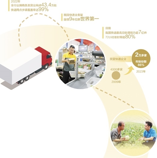 上圖:徐峰在查看快遞分撥情況。本報(bào)記者 王永戰(zhàn)攝 下圖:趙大榮(右)在為村民講解甜瓜包裝技術(shù)。受訪者供圖數(shù)據(jù)來(lái)源:國(guó)家郵政局