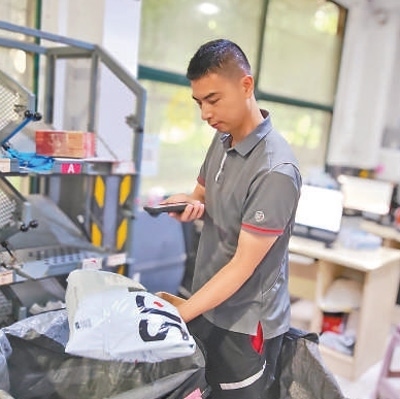 午后,湖北順豐速運(yùn)有限公司武漢唐家墩網(wǎng)點(diǎn),張?jiān):屯聜兪炀毜貙⒋笮〔灰坏目爝f件分類,裝入不同的袋子中。每裝滿一個(gè)編織袋,張?jiān)>驮诖谙路劫N上二維碼,再用機(jī)器掃描登記,確認(rèn)無(wú)誤后裝車發(fā)運(yùn)。