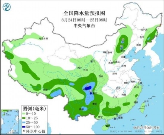 全國(guó)降水量預(yù)報(bào)圖(8月24日08時(shí)-25日08時(shí))
