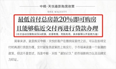 8月26日,紅星資本局向“中糧天悅”售樓部求證此時,一名置業(yè)顧問回復(fù)稱,最近確實推出了“先交付后還貸”的購房政策,購房者可以先交首付,簽訂購房合同,交房前再辦理貸款即可。