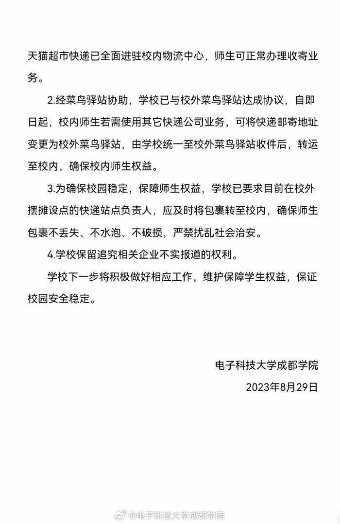 央視網(wǎng)消息:@電子科技大學(xué)成都學(xué)院 微博8月29日就網(wǎng)傳“成都一高校拒絕快遞進(jìn)校”發(fā)布情況說(shuō)明。其中表示,目前,中國(guó)郵政、京東快遞、順豐快遞三家快遞企業(yè)以及天貓超市快遞已全面進(jìn)駐校內(nèi)物流中心。