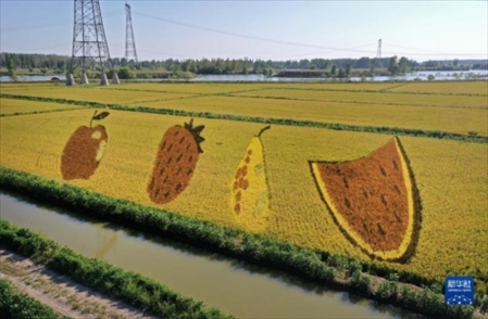 初秋時節(jié),遼寧省鞍山市臺安縣遼河文化旅游景區(qū)的稻田畫吸引不少游客前來參觀游覽。由多種顏色組成的巨型稻田畫勾勒出豐收壯美景象。