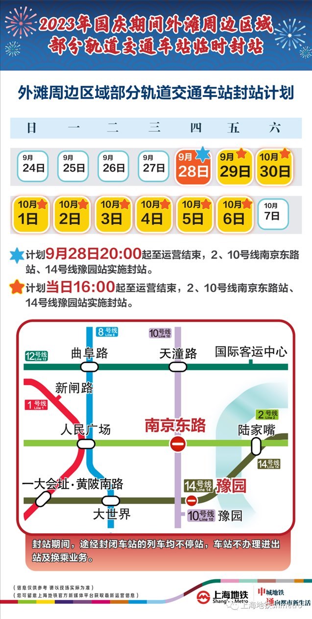 此外,9月28日20:00至運營結(jié)束,以及9月29日至10月6日的每日16:00至運營結(jié)束,地鐵2、10號線南京東路站,14號線豫園站計劃實施封站跳停。