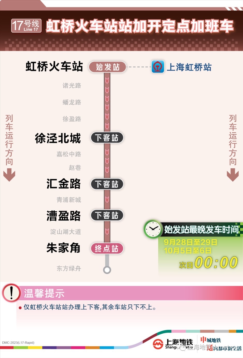 根據(jù)鐵路虹橋站夜間到達(dá)列車開行情況,9月28日、9月29日、10月5日、10月6日,鐵路在原夜間圖定計劃的基礎(chǔ)上增加了開行班次。為應(yīng)對鐵路臨時加開,做好虹橋火車站夜間列車集中到達(dá)大客流疏散工作,虹橋樞紐相關(guān)的地鐵2、10、17號線在既定延時或加開方案的基礎(chǔ)上進(jìn)一步增開定點加班車。其中,9月28日至29日、10月5日至6日夜間,虹橋火車站定點加班車最晚發(fā)車時刻為:2號線至次日2:00、10號線至次日0:30、17號線至次日0:00。同時,9月30日至10月4日,2號線和10號線虹橋火車站定點加班車發(fā)車時刻推遲至次日0:20。