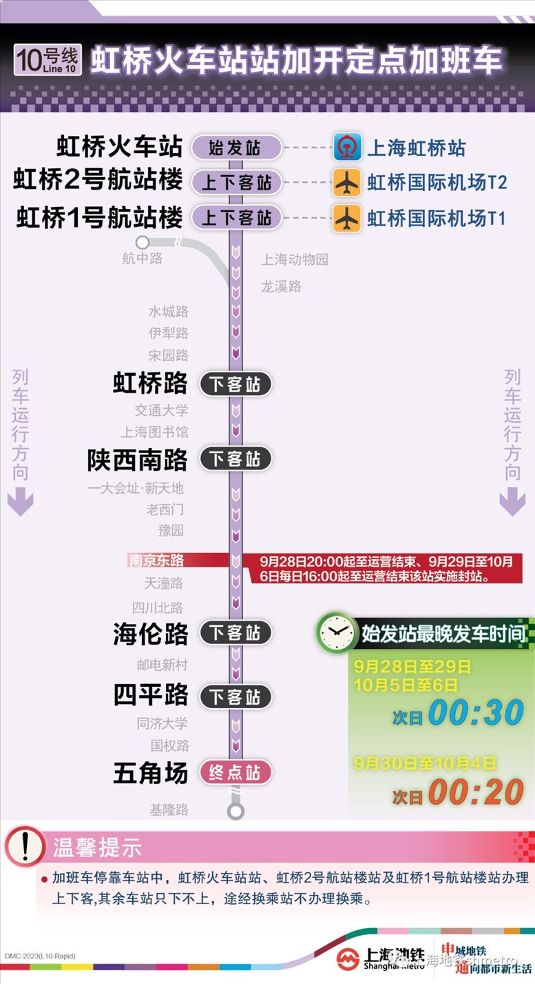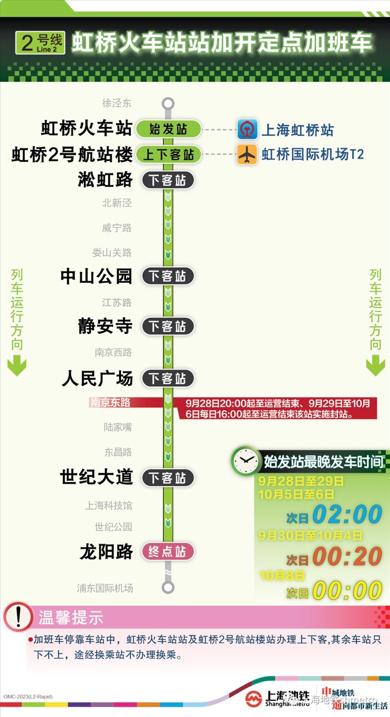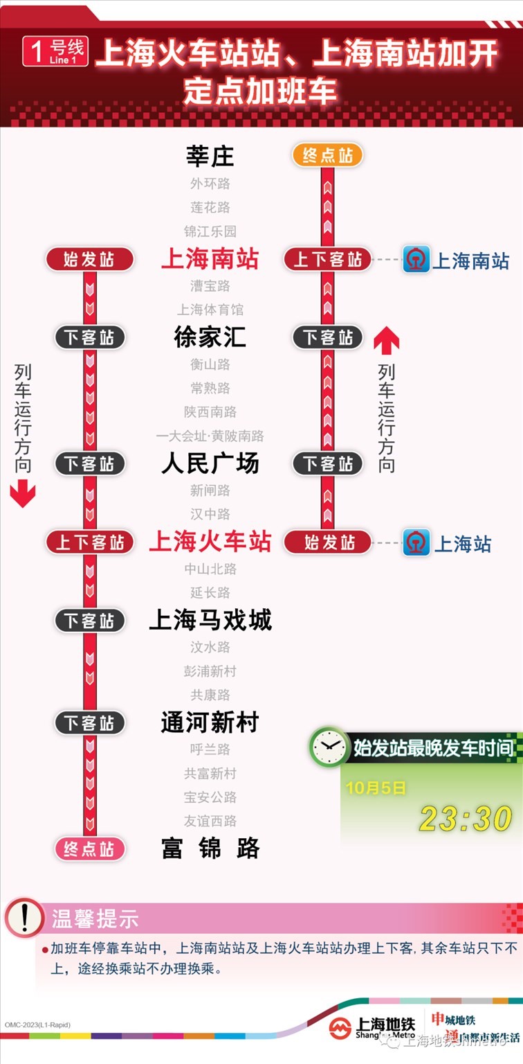 此外為做好節(jié)假日返程期間上海火車站、虹橋火車站、上海南站的夜間客流疏散工作,10月5日,地鐵1號線在圖定基礎(chǔ)上實施定點加開方案,加開末班車發(fā)車時間至23:30;另10月8日地鐵2號線增加定點加班車班次,加開末班車發(fā)車時間至次日0:00。