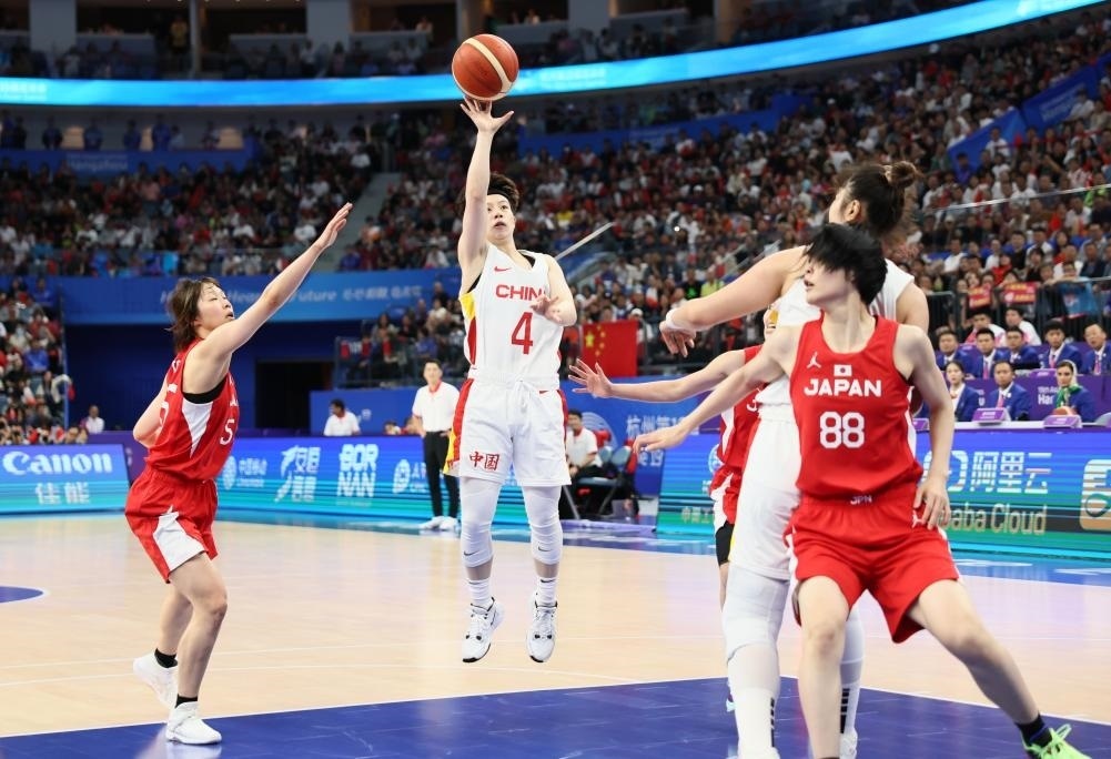 決賽開場,兩隊球員都略顯緊張,中國隊幾次中投失手,日本隊數(shù)次快攻也未能建功。依靠韓旭在內(nèi)線的牽制,黃思靜連續(xù)命中2記遠投,李夢突破打成“2+1”,中國隊打出17:7的開局。面對身材更高大的中國姑娘,日本球員通過不斷突破傳球創(chuàng)造得分機會。首節(jié),中國隊26:16領(lǐng)先對手。