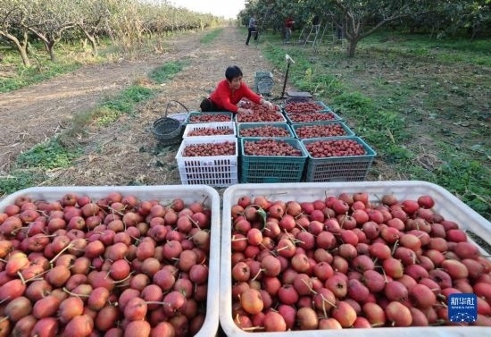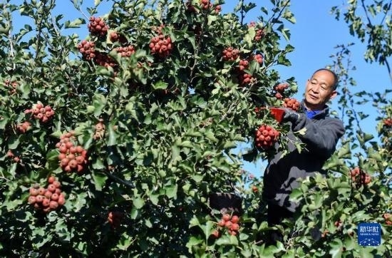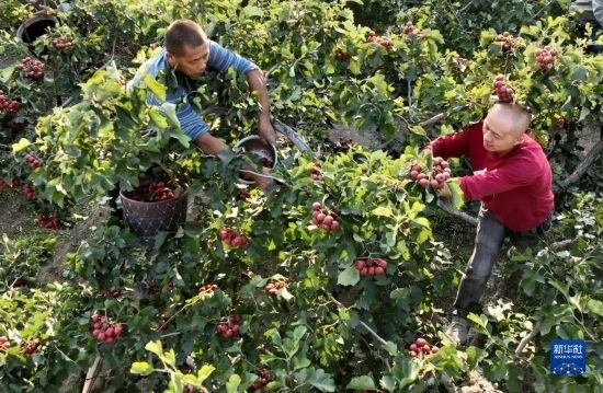 10月9日,河北省晉州市馬于鎮(zhèn)西賈莊村的農(nóng)民在果園采摘山楂。