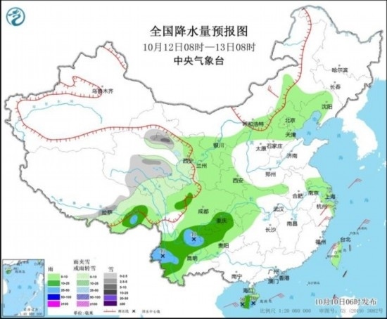 10月12日08時(shí)至13日08時(shí),甘肅西部、青海大部、西藏東部、四川西北部等地部分地區(qū)有小到中雪或雨夾雪,局地有大雪。西藏東南部、四川南部、重慶西部、貴州西北部、云南中西部和北部、海南島大部等地部分地區(qū)有中到大雨。內(nèi)蒙古中部、浙江等地部分地區(qū)有4~5級(jí)風(fēng)。東海大部、臺(tái)灣海峽、南海北部海域?qū)⒂?~7級(jí)、陣風(fēng)8~9級(jí)風(fēng)。