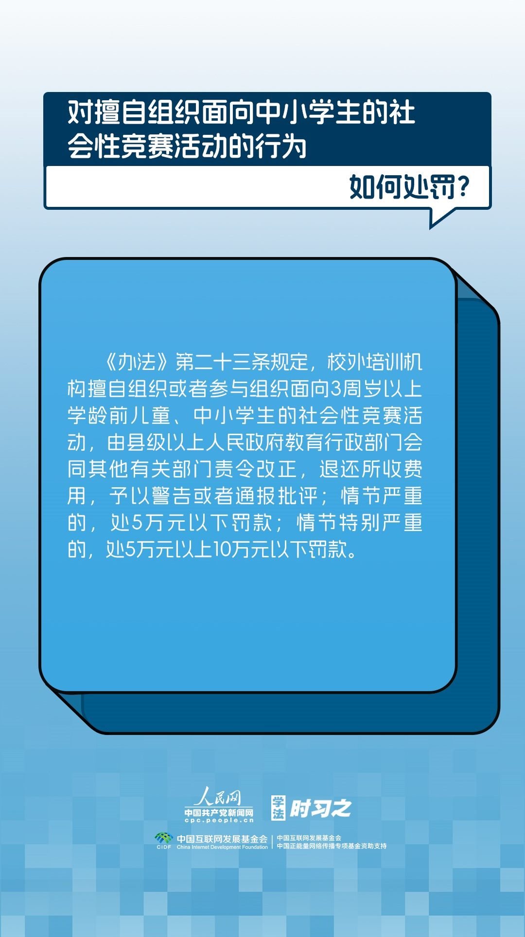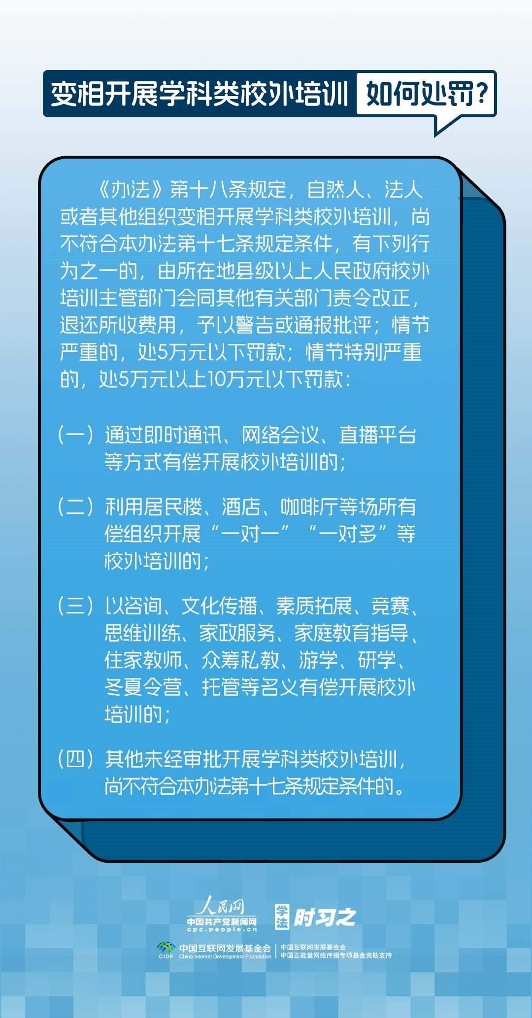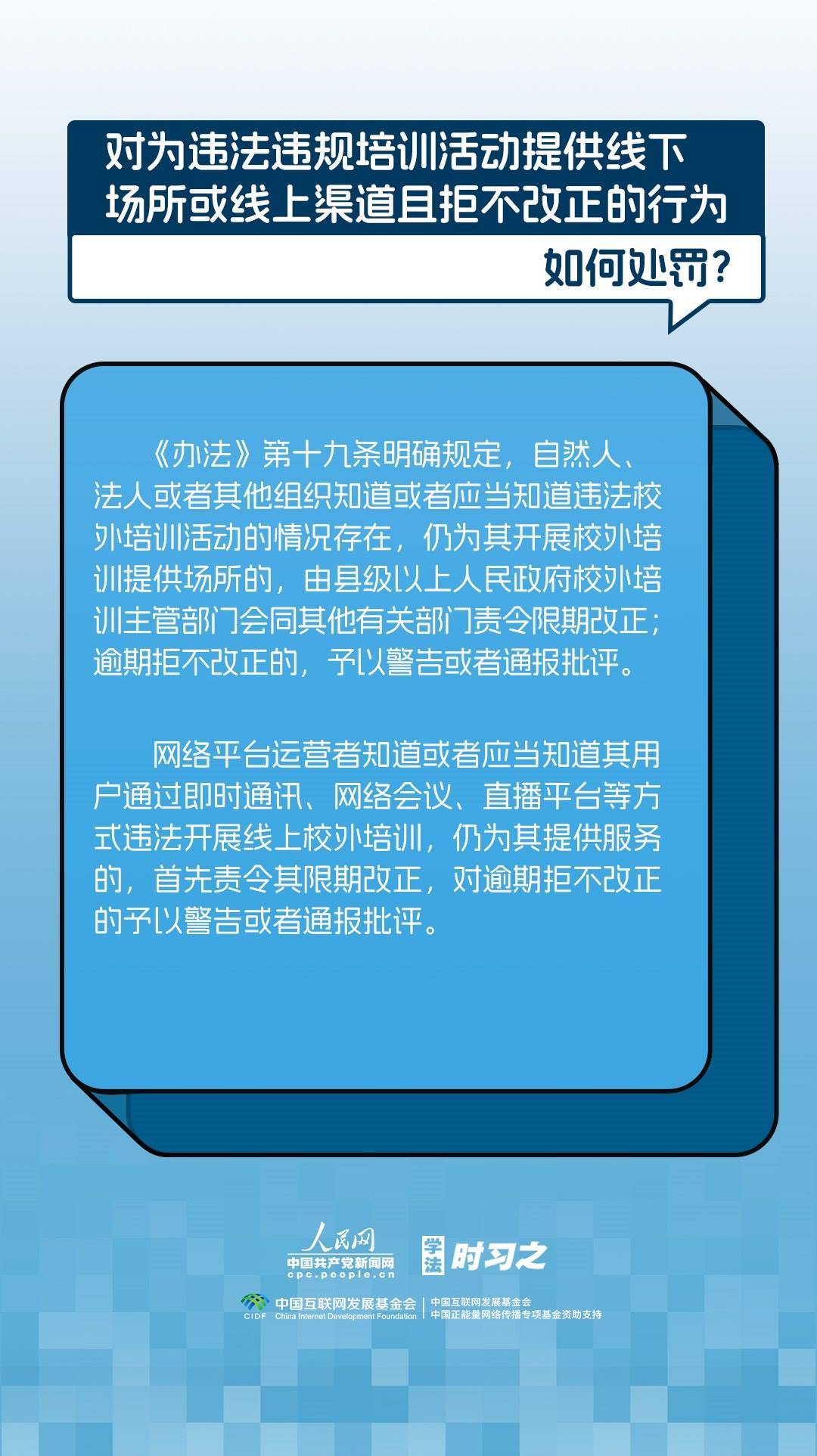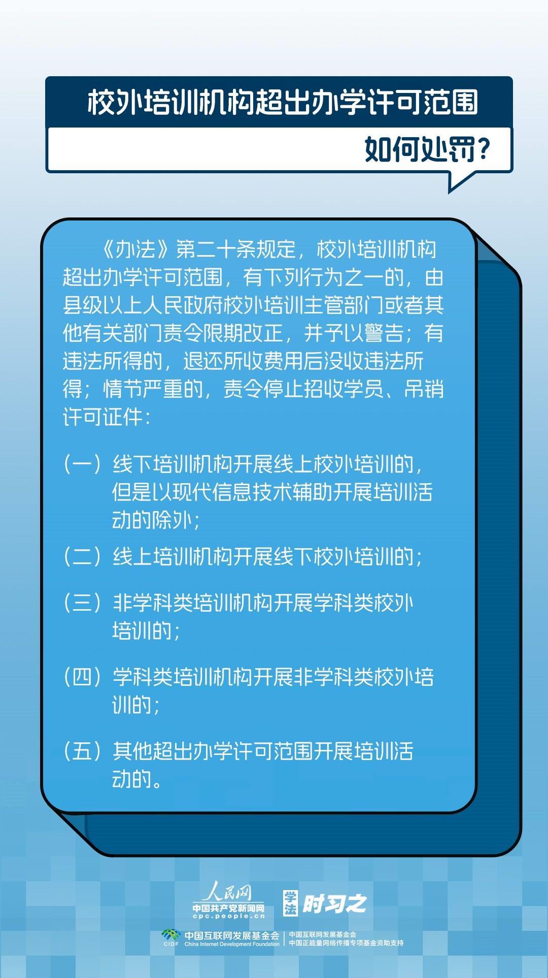 《校外培訓(xùn)行政處罰暫行辦法》(以下簡(jiǎn)稱(chēng)《辦法》)將于2023年10月15日起施行?!掇k法》提出了校外培訓(xùn)行政處罰總體要求。規(guī)定適用對(duì)象為面向社會(huì)招收3周歲以上學(xué)齡前兒童、中小學(xué)生,違法開(kāi)展校外培訓(xùn)的自然人、法人或者其他組織。要求校外培訓(xùn)行政處罰應(yīng)當(dāng)遵循公正、公開(kāi)的原則,堅(jiān)持處罰與教育相結(jié)合,引導(dǎo)自然人、法人或者其他組織自覺(jué)守法,共同抵制校外培訓(xùn)違法行為,營(yíng)造有利于學(xué)生成長(zhǎng)成才的良好環(huán)境。